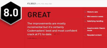 世界F1方程式赛车官方指定游戏《F1 2013》日前登陆PC,PS3和XBOX360平台,国外著名游戏媒体IGN自然不忘仔细评测该作一番,最后给予其8.0分的优秀评价,表示本作的改善虽然很有限,但这无疑是Codemaster工作室制作的当今最优秀最纯粹的F1游戏。