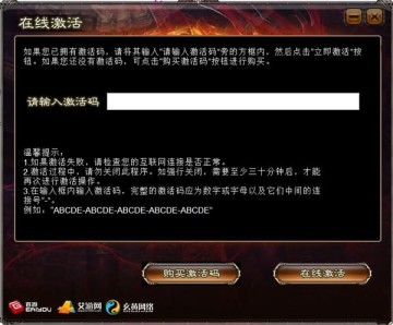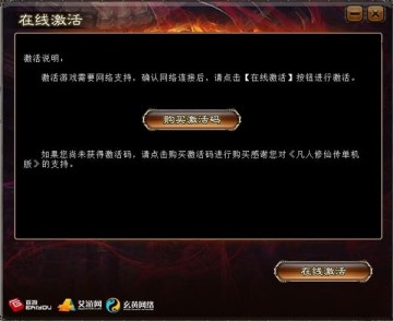 点击游戏开始后进入激活界面,如果你还没有购买凡人单机激活码,就点击购买激活码按钮;如果你已有激活码,就直接点击在线激活按钮。