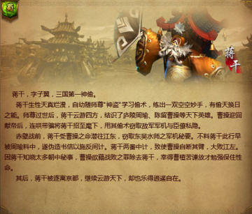 《英雄三国》这款国产竞技游戏受到广大玩家的关注,最近又公布了新的英雄-“蒋干”。下面给大家简单介绍蒋干的故事背景和技能。