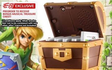 任天堂3DS新作《塞尔达传说 众神的三角力量2》预计2013年11月22日登陆欧美地区,其限定土豪金版3DS XL也将同期发售,现今任天堂官方公布了该限定版掌机的预约特典,那就是可以收纳5个3DS卡带的宝箱型收纳盒,值得一提的是当打开宝箱的时候还会播放游戏中获得道具时的音乐,十分有趣。