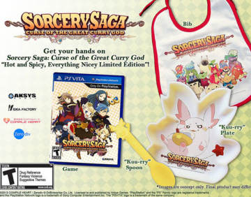 由Aksys Games工作室打造的PSV新作《圣魔导物语 伟大咖喱神的诅咒(Sorcery Saga: Curse of the Great Curry God)》将于2013年12月10日登陆北美地区,游戏将推出普通版和限定版两个版本,其中限定版将包括游戏本体、围兜、Kuu-rry盘子以及Kuu-rry汤匙,推荐给有爱的玩家入手收藏