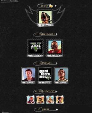 在《侠盗猎车OL》中,每个帮派除了“大佬(Leader)”外,还有四个阶层,分别叫做:干事(Commissioners)、头目(Lieutenants)、代表(Representatives)和打手(Muscle)。