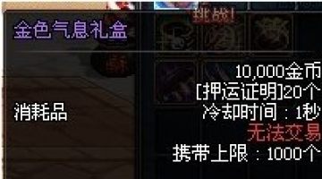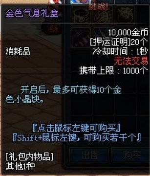 DNF金色气息礼盒获取方式 功能介绍 来源: 飞翔小编 2013/10/28 10:29:07 浏览量:1609 地下城与勇士DNF是腾讯的主打游戏之一,最近又推出新的道具”金色气息礼盒“开启礼盒之后会获得金色小金块,下面给大家简单讲解金色气息礼盒获取方式和功能作用。dnf金色气息礼盒怎么得?dnf金色气息礼盒在商城中售价为10000金币。dnf金色气息礼盒有什么用?玩家们开启之后,最多可获得10个金色小金块。