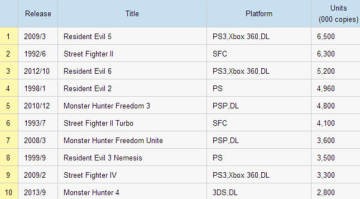 Capcom成立30周年纪念 《生化危机5》销量堪称最佳 来源: 飞翔小编feichenpan 2013/11/1 10:42:38 浏览量:451 今年是日本老牌游戏厂商Capcom公司成立30周年纪念,在这特殊时段其在官方网站上公布了旗下游戏作品的累计销量排行,获得冠军的竟然是2009年发售的《生化危机5》,其总销量为6500万套,而经典格斗游戏《街头霸王2》位居第二,获得第三名的是2012年的《生化危机6》。Capcom成立30周年纪念旗下游戏作品排行榜(前十位)