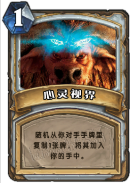 心灵视界,1点法力水晶,能够随机复制对手手牌中的一张牌,放入自己的手牌中。在运用上,心灵视界可以复制任何职业的卡牌,复制回来的卡牌都可被牧师使用。风险性上,心灵视界消耗为1点,就算复制到无用的卡牌,对我方法力水晶的损耗也不大。在复制的结果上,最好的结果莫过于抽中对方的王牌卡牌,在形势上取得对等优势。但是考虑到很多职业的卡牌专用性,特别像猎人及萨满,卡组中容易出现许多需要专门配合野兽卡或图腾卡才能发挥作用的卡牌。为了避免不必要的浪费,心灵视界不建议在对猎人作战时候优先使用。
