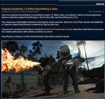 Capcom预计《丧尸围城3》的销量将达到120万 来源: 飞翔小编feichenpan 2013/11/5 10:10:25 浏览量:259 根据Capcom官方的最新情报,其预计XBOX ONE独占游戏《丧尸围城3》的销量将达到120万,远远低于《丧尸围城2》的270万和《丧尸围城1》的180万。据悉《丧尸围城3》将以720p的画面呈现,并且锁定为每秒30帧,这样的素质在XBOX ONE次世代主机真的可以吗?《丧尸围城3》将于2013年11月22日发售,同XBOX ONE主机一同上市。