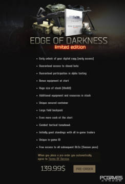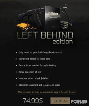 这四个版本最便宜的是标准版游戏,送数字版游戏一套,封闭测试资格和游戏内装备奖励。不过想要提前体验游戏在Steam上的early access测试和Alpha测试,玩家需要预购“Left Behind(掉队)”版或其他更为高级的版本。最贵的版本售价140美元,叫做“黑暗边缘”限定版,收录游戏发售后的所有DLC。