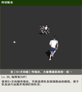 指 挥官掌握着全队的进攻节奏。传切配合技能的触发需要按两次方向键,第一次是确定传向的队友,第二次则是球偏转的方向。例如,当指挥官在中路控球,而左前方 有队友正在禁区角接应时,不妨尝试按下左前+S传球后,马上按下右方向键,让传球引领队友迅速切到中路,直接威胁球门!