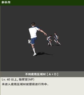 指挥官无需独自控球突破下底,而是可以使用斜长传技能,直接从45度角将球吊入禁区。需要注意的是,指挥官的斜长传落点一般为后门柱,前锋球员需要提前跑位接应!