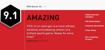 《FIFA14》PS4版IGN详细评测 获得9.1高分评价 来源: 飞翔小编 2013/11/12 11:28:57 浏览量:1060 EA足球游戏《FIFA14》的PS4版即将于11月15日发售,国外著名游戏评测媒体IGN提前拿到了该版本游戏,对其进行了一番详细评测,并且给予其9.1的高分评价,下面就来看看IGN的详细评测吧。评分:9.1优点:1.大幅度提升的动画2.具有自我意识的球员3.更加优秀的氛围4.优秀的多元化缺点:不是一个质的飞跃总结:次世代主机上的《FIFA 14》更加精雕细琢,优化也更加优秀,是一个让人非常满意的版本。