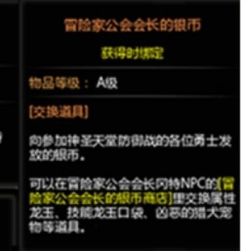 冒险家公会会长的银币 可兑换的道具:各A级龙玉,技能龙玉口袋,凶恶的猎犬宠物。
