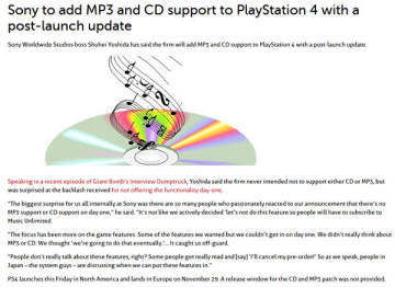吉田修平说道:“我们很惊讶在首发时不支持MP3或者CD会让如此多的玩家变得情绪化,就好像‘别有这功能好让玩家们去注册Music Unlimited'服务一样。关注的风向曾经变得不再是游戏功能了,有一些功能是我们无法在首发时提供的,当时就没想到首发时需要支持MP3和CD。”