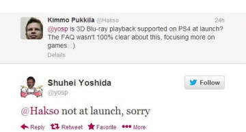 索尼全球工作室总裁吉田修平一向很热心回答玩家在其推特上的提问,近日有位玩家在吉田修平推特上提问PS4上市时是否支持3D蓝光碟播放,他回答道暂时不支持,看来PS4的3D蓝光播放功能需要等待系统更新升级后才会支持,这与微软XBOX ONE如出一辙。