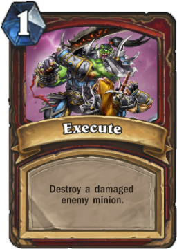 斩杀是一个非常疯狂的——只耗费1点水晶能量就可以直接摧毁一名受过伤害的仆从的法术。这张卡牌可以改变场上局势,当得知所召唤的强力仆从有可能会被如此简单地杀死时会迫使大多数玩家调整他们的策略来更小心谨慎地出牌。没有比花了7或8点能量召唤出来的大杀器,却只因为攻击了一个低等仆从然后受到两点伤害就被直接干掉更糟的事情了。在你的战士卡组里放满两张斩杀是必需中的必需。