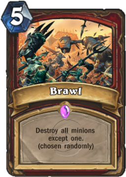 让我带你见识一下战士军械库里的史诗级卡牌吧。作为一张费用高昂——整整高达5费——是战士专属法术中费用最高的卡牌,大乱斗摧毁场上所有仆从,只留下一个。在集换式卡牌游戏的术语中,有一个词叫做“逆转牌”,指的是当一名玩家处于极大劣势退无可退之时,凭借这一张卡来反败为胜逆转胜局。大乱斗就是战士卡组的“逆转牌”。被打得头破血流,面对着一整个部落的敌人?对于加尔鲁什·地狱咆哮来说,这情形很可能在5.4的补丁中发生,不幸的是,在魔兽世界里,他可不能花费5点能量来干掉他的所有敌人。但在炉石传说的世界里,这是完全可行的。你必须睿智地使用这张牌,当你场上有3个仆从而对手只有1个时丢下这张卡是不明智的,除非你的对手要挟你要你故意输掉这场比赛,因为这样你会损失比你对手更多的仆从。