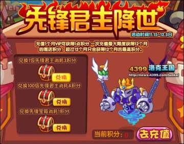 在11月15日-12月15日,先锋君主降世活动期间,去充值VIP可以获得积分,去VIP广场,打开先锋君主降世活动弹窗,可以兑换先锋君主奖励哦!
