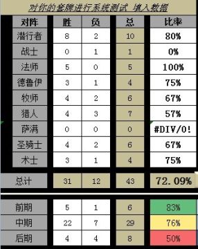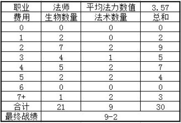 这样的一套牌,应该会是比较稳定,也比较顺手的防守反击式套牌,接下去一段时间里,我会遵循这样的原则,集中在竞技场里练习一番并加以记录,看看是否足以打造出最佳竞技场卡组类型,有人有兴趣的话也可统计一下,不需要具体的卡组,而是统计平均法力曲线,各种费用卡牌多少张数,其中多少张生物,多少张法术,选用的职业,最终战绩。大概的格式如下。