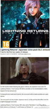 《最终幻想13雷霆回归》现已登陆亚洲地区,其美版将于2014年2月11日发售,欧版则于2月14日上市,根据Square Enix最新情报显示,该作欧美版将同步推出日语包DLC,在其售后两周内免费配信,之后想要下载的话需付费下载。值得一提的是,该DLC不光是语言追加日语,就连人物唇型也与日语语音保持一致。