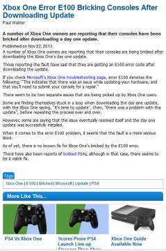 微软XBOX ONE安装首个升级补丁出现E100错误 来源: 飞翔小编 2013/11/24 10:52:00 浏览量:724 微软XBOX ONE主机发售后可谓问题不断,根据外媒游戏网站nowgamer的报道,部分拿到主机的玩家在安装首个升级补丁后,新主机就出现E100错误信息导致变砖。而根据微软官方的说法,E100错误信息表示升级硬件过程中出现错误,只能返厂修理。还有玩家表示,Xbox One提示用户更新首个补丁(强制),但更新后却出现升级错误,然后两条信息无限循环,导致主机无法使用。目前,还不清楚有多少玩家遇到类似问题,微软也尚未对此进行回应。