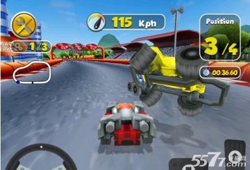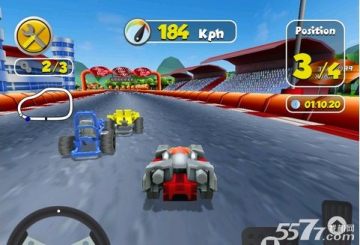 首先小编给大家介绍的是画面方面:上文小编说了它采用的是卡通题材,但它更是3d模式,而且色彩亮丽丰富,制作精美细致,将虚幻和真实完美的结合,十分有趣味十分另类,真心不错。让大家既能享受极速赛车的同时欣赏梦幻般的卡通世界哦。