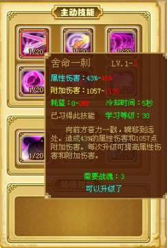 舍命一刺:向前方奋力一戳,瞬移到远处。造成43%属性伤害和1057点附加伤害。每次升级可提高属性伤害和附加伤害。