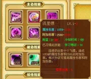 流星镖:连续扔出数十个飞镖。造成105%属性伤害和2580点附加伤害。每次升级可提高属性伤害和附加伤害。