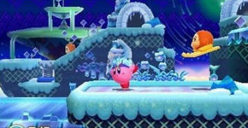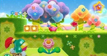本次的卡比中有着富于纵深感的不可思议的关卡;不仅是横版前进,还可以往深处和前面来。这个机能有时用来解谜有时又来战斗,还有需要倾斜3DS主机的设计。