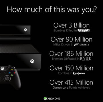面对索尼近期公布了PS4全球销量突破210万台,微软至今尚未公布XBOX ONE的销量,只是曝光了一堆粉饰游戏成绩的数字,例如在《丧失围城3》中有30亿个僵尸被杀死,在《极限竞速5》中已经驾驶了9000万米等。
