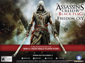 《刺客信条4黑旗》将于12月17日推出其首部剧情DLC自由之泣(Freedom Cry),该DLC将提供新刺客角色“寒鸦号”黑人大副Adewale的任务关卡,会为玩家带来4个小时以上的游戏流程。