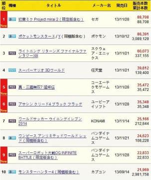 《初音未来 未来计划2》获得日本游戏销量排行榜冠军 来源: 飞翔小编feichenpan 2013/12/5 10:17:19 浏览量:331 根据最新一期日本游戏销量排行榜,SEGA音乐游戏《初音未来 未来计划2》以8.8万首周销量获得冠军,紧随其后的是任天堂的《口袋妖怪XY》,这周销量8.6万,其累计销量突破308万;获得第三名的是Square Enix的《最终幻想13雷霆归来》,这周销量达到6万套,累计销量33.7万套。最新日本游戏销量排行榜前十位: