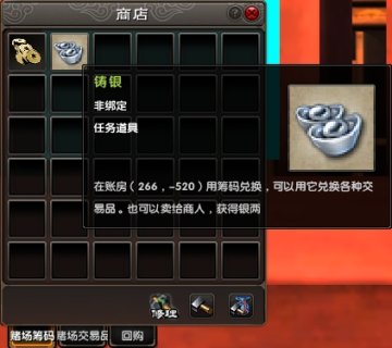 “银钩舫账房”处还可以用“筹码”兑换“铸银”,“铸银”可以用来重新换回成碎银,也可以用以兑换其他道具(目前可兑换道具未投放,敬请期待)。