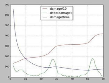 红色线条为具体伤害值,为了方便绘图,将数值除以了10,比如图上200意思就是2000的伤害,即伤害加成系数2.0;绿色线条为伤害值的时间导数,即伤害系数本身的时间增量;蓝色线条为伤害值与时间的比值,即秒伤