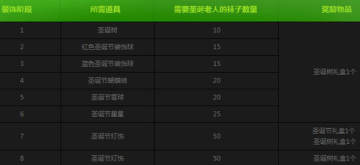 使用装饰品装饰圣诞树的时候,可以获得一定的奖励。装饰圣诞树一共分为8个阶段,每个阶段需要不同的物品,详情如下所示: