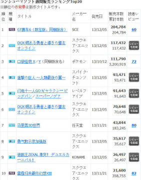 新一期日本游戏销量排行榜前十位(2013年12月2日~12月8日):