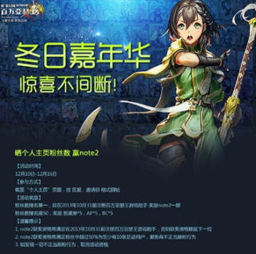 而在今日,游戏助手也将开启冬日嘉年华活动第二波。除了公会人气排行榜外,助手上将同步开启个人人气排位战——晒个人主页粉丝数。在活动期间内,按照一定方式参与活动回帖,粉丝数前50名的玩家都将获得一定的道具奖励,而人气最高者也将获得三星NOTE II一部。