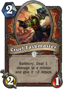 残酷的监军是一张与激怒机制良好契合的,非常有潜力的超棒卡牌。当一名仆从负伤时,激怒效果就会触发,除非这名仆从死去或者被治疗到满生命值,否则激怒效果会一直持续。只需要2点能量,残酷的监军就可以入场对1名仆从造成1点伤害,并使该仆从获得2点攻击力,这一效果在2/1属性的仆从中出类拔萃。该效果可以用来激活拥有激怒效果的卡牌;杀死只有1点生命值的敌方仆从;或是使对方仆从的攻击力增加到7以上好让王牌猎手的效果能摧毁它(还记得我们在第一期提到过的王牌猎手+暗影步的combo组合吗?),又或是作为最单纯的以1点生命值的代价增加己方仆从2点攻击力,这张卡的用途千变万化。这张卡非常适合战士卡组,是优先放满2张的存在,如果你的卡组有很多激怒机制的卡牌,这张卡是你必须拥有的。