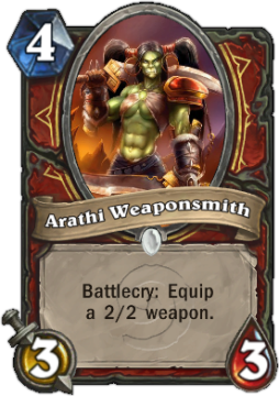 这是另外一张战士风格直截了当的卡牌,4能量花费,你获得一名3/3的仆从,并且加尔鲁什还会装备上一把2/2的武器。如果你在寻找卡牌填充你的4能量仆从位置,这一张卡或者库卡隆精英(冲锋)都是非常不错的选择。