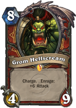 加尔鲁什应该庆幸他的父亲只是以卡牌的形式回归,否则他对加尔鲁什当上酋长后的所作所为肯定会有诸多不同的见解。这张战士专属的传奇仆从召唤费用达到了惊人的8点,但一旦被召唤出来,他有着对对手造成致命一击的潜力。格罗姆拥有4/9的体质以及冲锋和激怒效果。还记得我们在文章开头就提到过的残酷的监军吗?他和格罗姆能起到绝妙的配合,如果你碰巧抽到他,又或者你成功地将其保存到格罗姆入场的时刻,通过激怒,格罗姆获得额外的6点攻击力,让他成为10/9的怪物。幸运地是,这张卡只有在第8回合才能上场,你的对手一定会绞尽脑汁用他的仆从来试图杀死格罗姆,但如果格罗姆存活下来,他很可能能为你带来这场战斗的胜利。