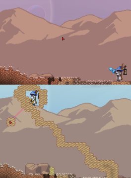 (1)保护自己。 挖矿的时候会碰到一些怪物,尤其是星球表面探矿的时候或遇到地下坑洞的时候。为追求进度,本人经常做什么好的装备就去挖矿了,被怪碰一下不死也残,所以听到怪物的声音立刻点火照明,如果怪物逼近就用土围住自己,如果怪物稍微远点就用土围住敌人。
