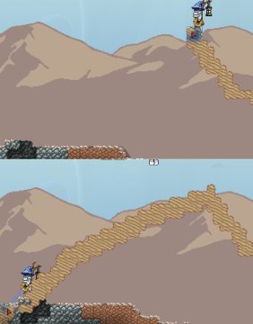 在矿井或是星球表面,想要斜上移动或是向下移动,就可以通过制造土墙建立落脚点。操作方式是将土块点在脚下不放,按跳跃上升,在高处按前进下降。通过调整土块的位置进行平移。当然也可以建好了阶梯再移动(比较稳妥,不过我一般不这么干)。