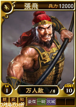 《三国志12对战版》“新兵种包”中,具有压倒性防御力的驱敌枪兵系统“藤甲”将会得到亮相。同时还有兼具高攻击力和机动力,并可发动强力特殊攻击“暴击”的弓兵系统“乌丸”等,到现在为止还没有出现过的兵种附带武将卡牌也会得到追加。并且,身披重装,攻击力和防御力都很强大的刘备、关羽、张飞等武将卡牌将一同登场。