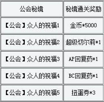 《百万亚瑟王》纯白活动秘境和公会秘境通关奖励 来源: 飞翔小编 2013/12/19 10:06:09 浏览量:623 卡牌网游《百万亚瑟王》在12月17日至31日期间开启了全新的活动秘境和公会秘境,玩家通关这些秘境可以获得丰富奖励,例如扭蛋券,AP和BC回复药,金币等,下面就给大家分享的就是《百万亚瑟王》纯白活动秘境和公会秘境的通关奖励。纯白活动秘境通关奖励:公会秘境的通关奖励: