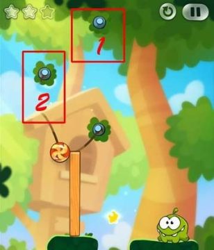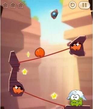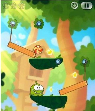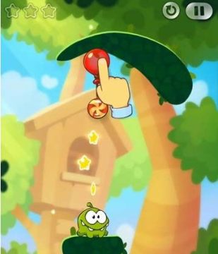 当中间的星星移动到中间位置时,马上点击泡泡让糖果落下来,刚好能获得三颗星星。