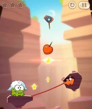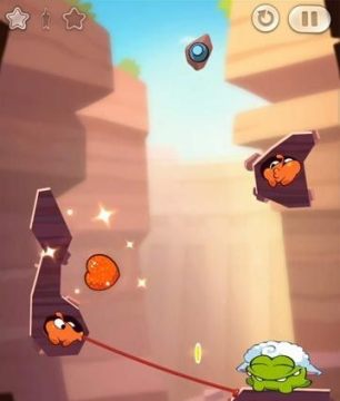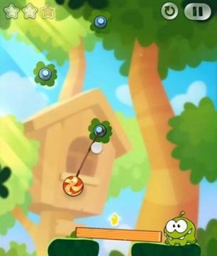 2、当糖果摇摆到最左边并要向右边摇动的时候,马上割断绳子,这样糖果就会滚到小绿怪的嘴里了。