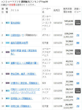 《智龙迷城Z》首周售出56.3万 获得销量排行榜冠军 来源: 飞翔小编feichenpan 2013/12/20 10:40:23 浏览量:210 根据最新一期日本游戏销量排行榜的情报显示,3DS益智游戏大作《智龙迷城Z》不负众望,首周销量高达56.3万套,实在是可喜可贺;紧随其后的依然是长卖游戏《口袋妖怪XY》,这周销量15.9万,累计销量336万;获得第三名的是WiiU主机新作《超级马里奥3D世界》,这周销量5.7万。累计销量24.1万。日本游戏销量排行榜前十位(2013年12月9日至12月15日)