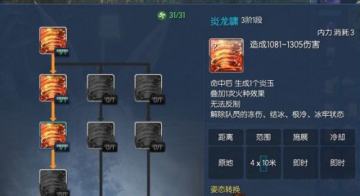 炎龙啸点出1阶3段,主要减少了内力消耗量,从一次5内力更改为一次3内力,而且增加了一半的范围,很好的群体攻击技能,如果触发了万魂效果,这个可以一直用,想想都有点小激动呢。