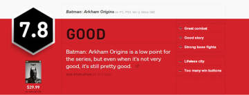 《蝙蝠侠:阿甘起源》是《蝙蝠侠》系列的第三部作品,尽管游戏有创新,内容也着实不错,但是相较于前两作而言确实又比较粗糙,没有前两作的细腻感,故而IGN只给出了7.8分这个还算的不错的成绩。