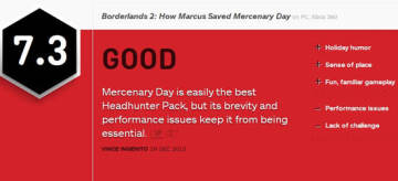 总评: 《佣兵日》是《无主之地2》“猎头者”包中最成功的一部DLC,它非常完好地再次呈现了该系列最成功最有创意的元素。它关于圣诞节习俗的恶搞足足让笔者笑了半小时,只是内容本身略显拼凑感,与以往的内容有些雷同。如果你依然对《无主之地2》依依不舍,经常玩这款游戏,那么《佣兵日》和其他优秀DLC一样,非常值得你反复通关,但除了笑料和枪炮以外,也不要期待有什么更多的惊喜。