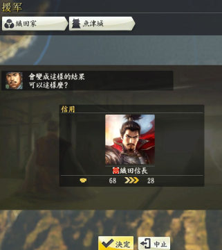 9月要援军下上杉鱼津城(这里读过几次档,第一次下城后,织田军去春日山了,完全不用防守,忘了存档...后面几次织田暂时撤了,要面对上杉3000兵,读几次都不行,没办法,还好别的地方没有战事,进入战场拖延时间然后撤退,等魔王大军前来就好了),春日山不用想了,防太高酱油也不容易。织田大军去春日山后,找机会下上杉家根知城,那里没兵没将。200兵找武田打一仗,换取德川关心,外交德川(武田被灭前换一年到两年同盟以便魔王和北条改善态度,毕竟不是每次都能找到合适的礼物,前期就靠卖兵粮维持外交了)。