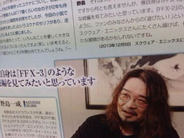 Square Enix的《最终幻想X/X-2 HD》现已正式发售,在游戏官方解说书《最终幻想X HD Ultimania》中,负责最终幻想系列剧情的野岛一成就表示非常想看到《最终幻想X-3》这样的续作游戏。